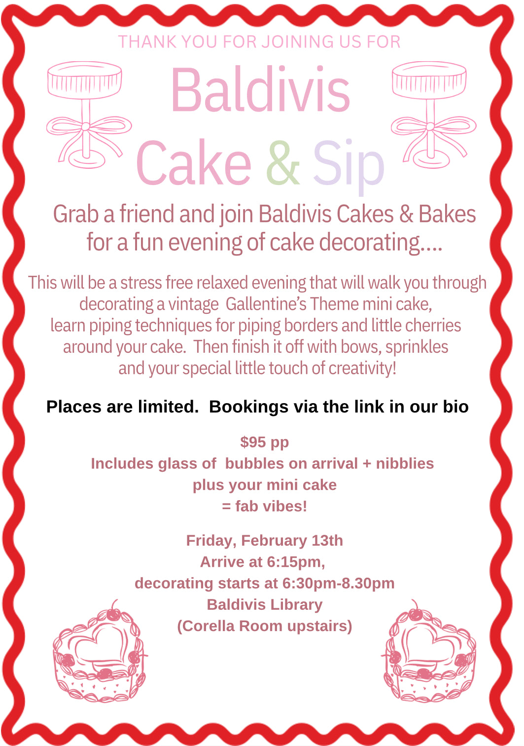 Arrive at Baldivis Library (Corella Art Space & Meeting room take the lift to 1st floor)  $95/PP (your ticket covers 1 x cake and decorating workshop for 1 person).